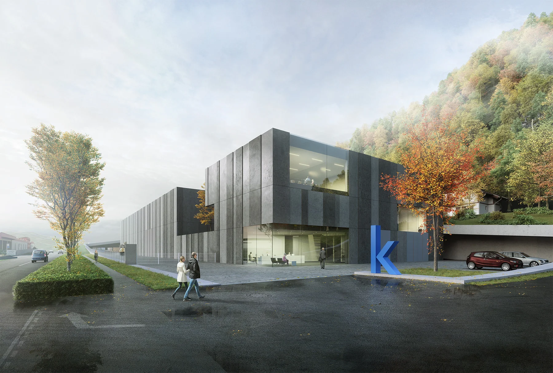 Das Wettbewerbsareal befindet sich in Schrambach, Gemeinde Feldthurns, im Süden von Brixen. Das Grundstück ist langgezogen und steigt gegen Süden und im Westen hin zu einer Wohnbebauung an. Ein langgestreckter Baukörper wird so ins Areal gelegt, dass folgende Bereiche entstehen: Einfahrts- und Eingangszone, ein einziger Baukörper mit Bürotrakt und Halle, Betriebshof und Freigelände. Das Bürogebäude bildet eine Funktionseinheit, welche mit der Halle in enger Beziehung steht. Durch seine Proportion und Höhe hebt sich der Bürotrakt auch visuell von der Halle ab, bildet durch das Durchziehen des gleichen Fassadenmaterials jedoch eine Einheit. Die Absenkung des Betriebshofes versteckt diesen und stellt das Gebäude in den Vordergrund. Der überdachte Freibereich und die Rampe im Süden des Geländes werden begrünt und dienen als Lärmschutz für die Wohnbauzone. Die Halle und das Bürogebäude sprechen hinsichtlich Form und Materialität eine einheitliche Sprache. Der horizontale Gesamteindruck zeugt von Bodenständigkeit, die Fassadengestaltung in Beton verankert den Betrieb im Baugewerbe und die edle Sichtbetonqualität weist auf die Immobilientätigkeit hin, ohne großspurig zu erscheinen.